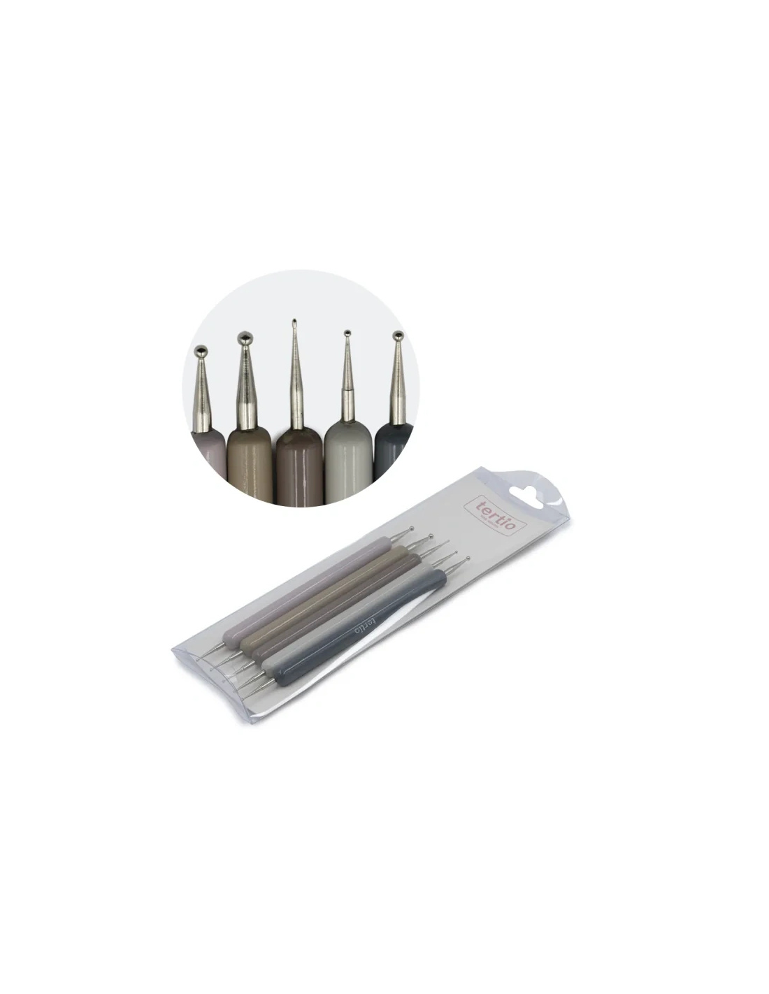 Domina el arte del nail art con este elegante set de 5 punteros dobles Tertio, perfectos para crear puntos, flores, líneas y diseños artísticos con precisión.