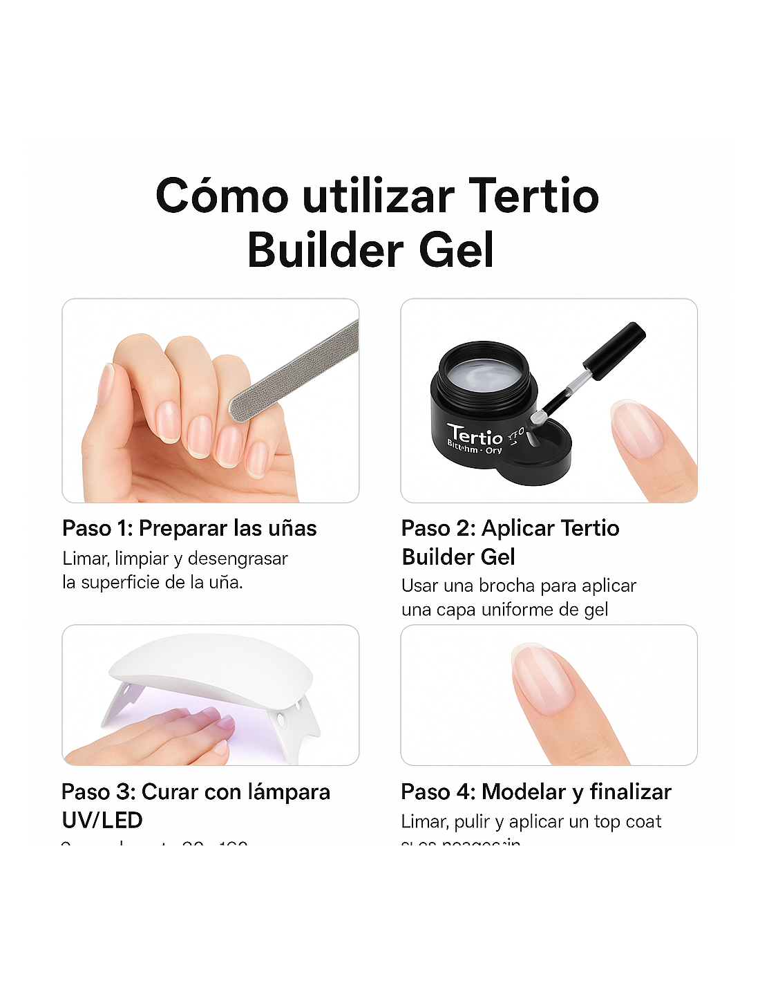 Descubre el poder del Tertio Builder Gel, un gel constructor profesional ideal para esculpir, reforzar y dar forma a las uñas con resultados duraderos y de alta calidad. Su fórmula 2 en 1 es compatible con lámparas UV y LED, ofreciendo un acabado transparente y resistente que se adapta tanto a uso profesional como personal.