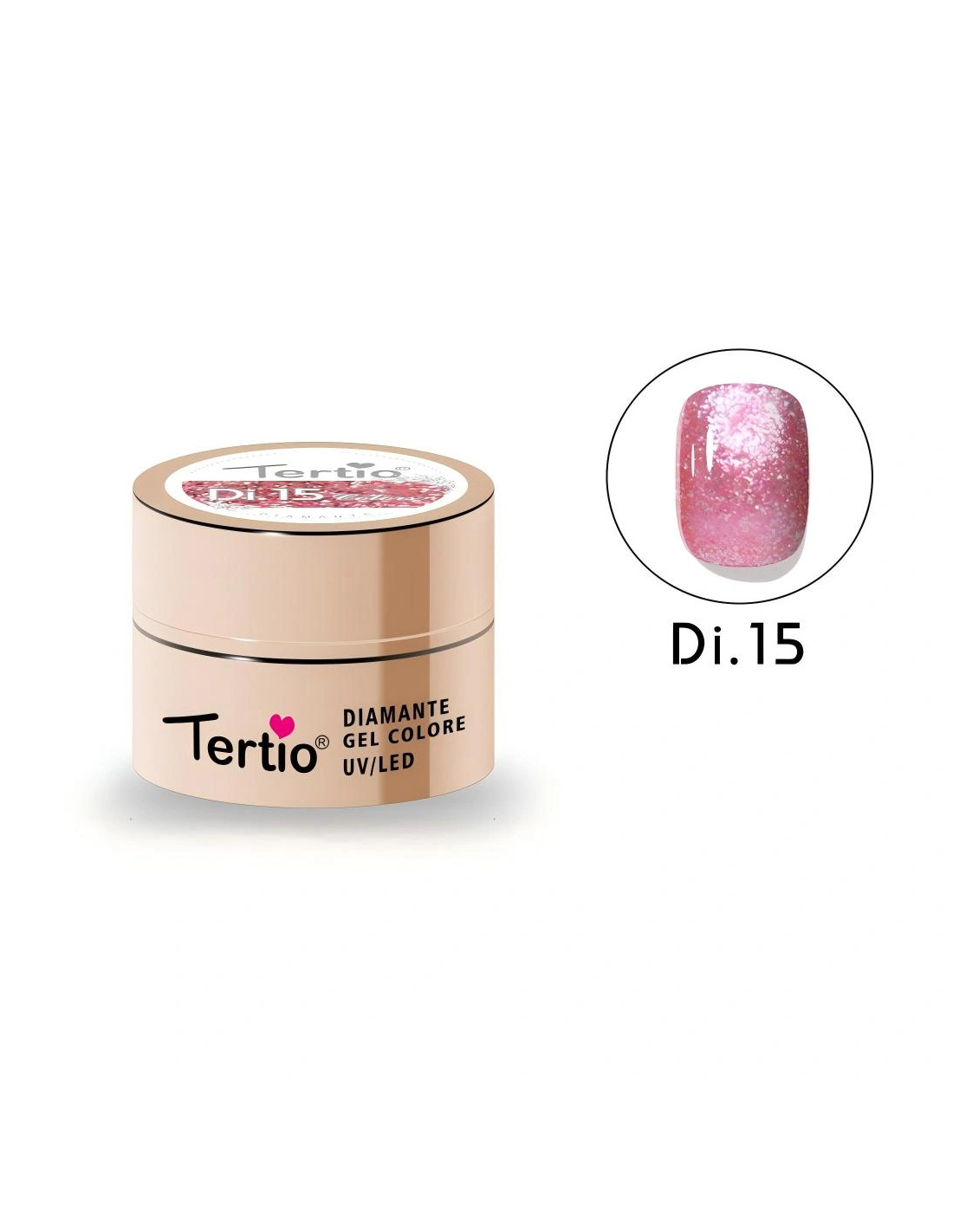 El Tertio Diamante Gel es un gel de color profesional diseñado para crear un acabado brillante tipo diamante, con partículas reflectantes que aportan un efecto luminoso y elegante en cada aplicación.