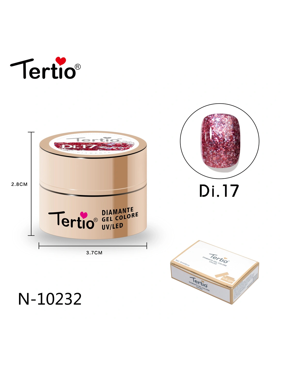 El Tertio Diamante Gel es un gel de color profesional diseñado para crear un acabado brillante tipo diamante, con partículas reflectantes que aportan un efecto luminoso y elegante en cada aplicación.