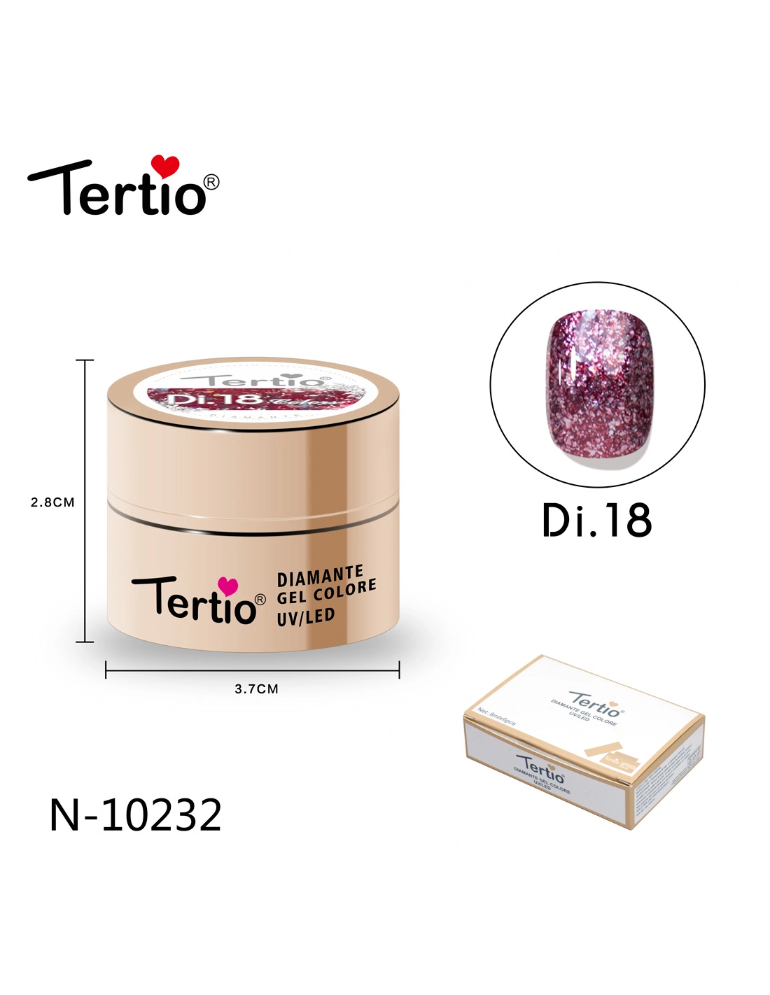 El Tertio Diamante Gel es un gel de color profesional diseñado para crear un acabado brillante tipo diamante, con partículas reflectantes que aportan un efecto luminoso y elegante en cada aplicación.