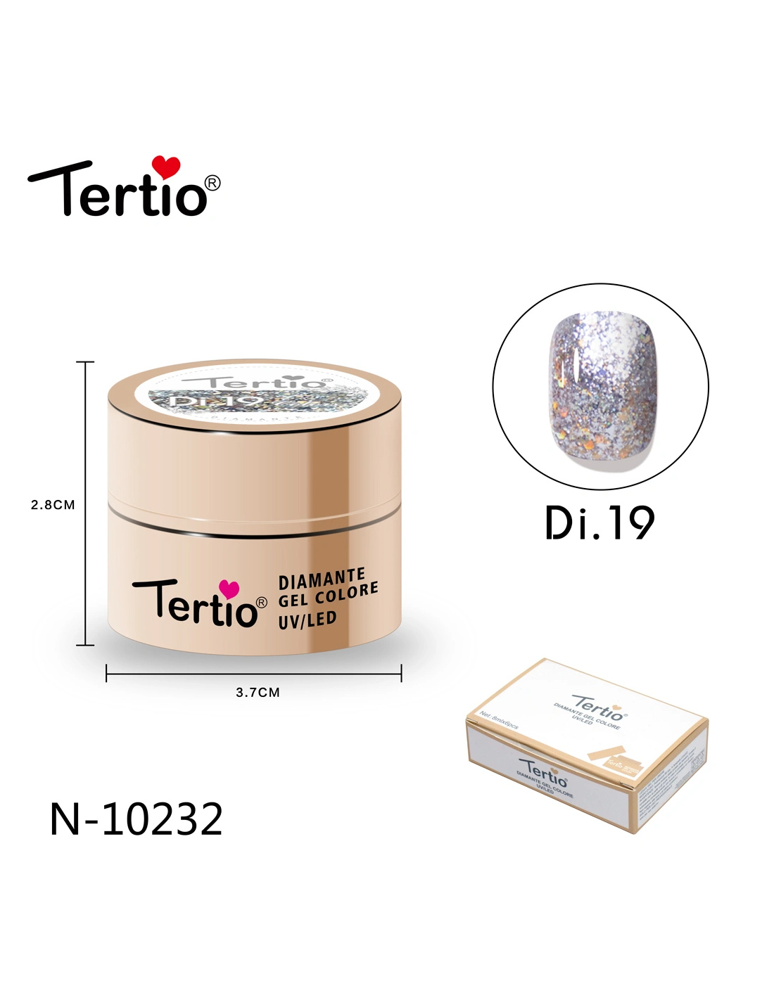 El Tertio Diamante Gel es un gel de color profesional diseñado para crear un acabado brillante tipo diamante, con partículas reflectantes que aportan un efecto luminoso y elegante en cada aplicación.
