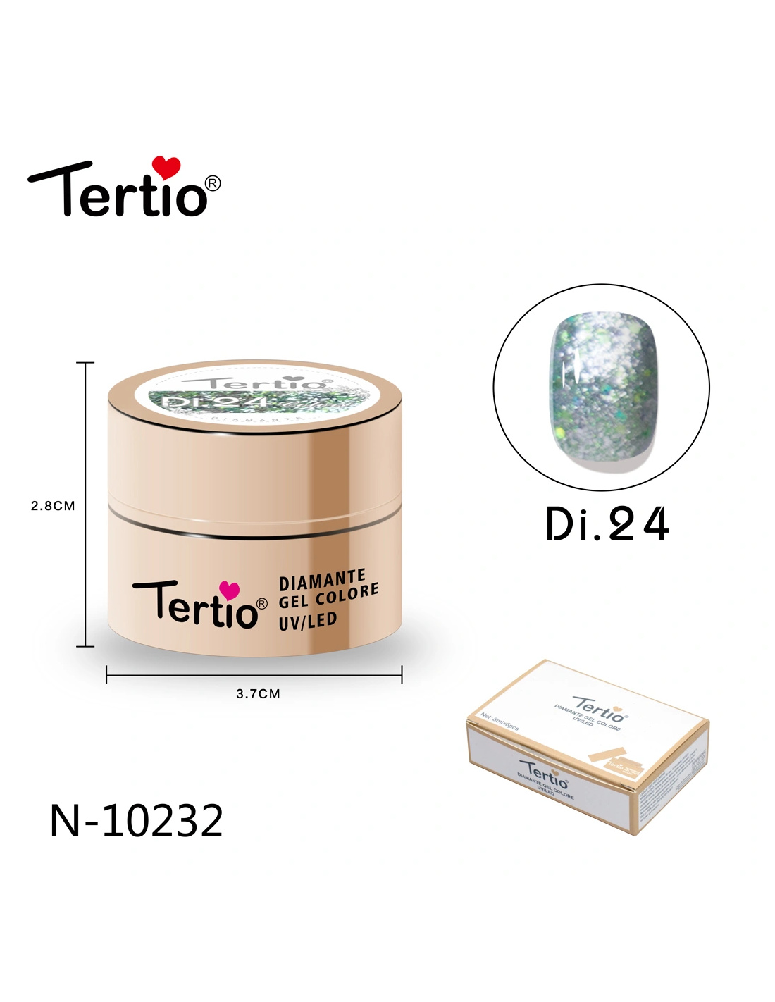El Tertio Diamante Gel es un gel de color profesional diseñado para crear un acabado brillante tipo diamante, con partículas reflectantes que aportan un efecto luminoso y elegante en cada aplicación.
