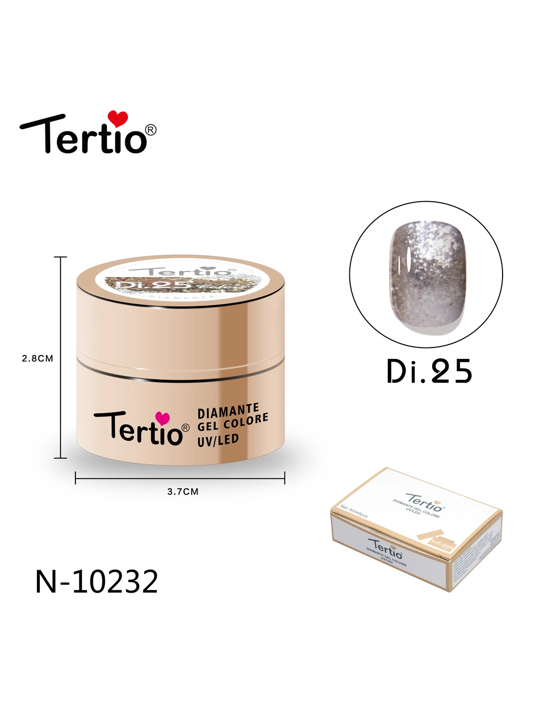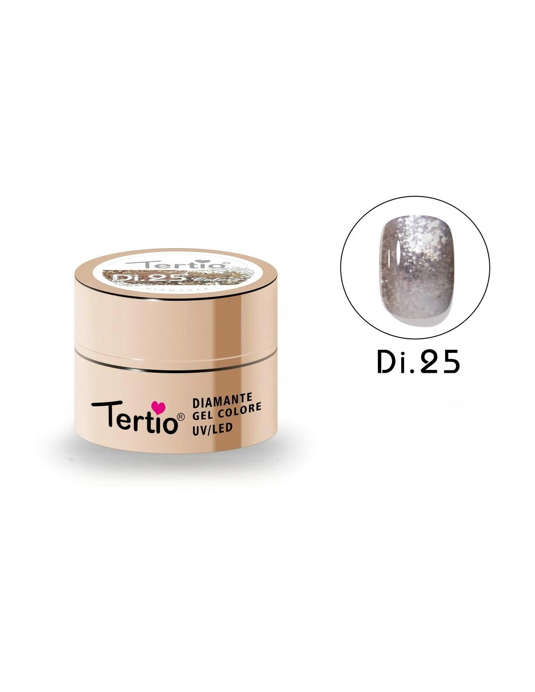 El Tertio Diamante Gel es un gel de color profesional diseñado para crear un acabado brillante tipo diamante, con partículas reflectantes que aportan un efecto luminoso y elegante en cada aplicación.